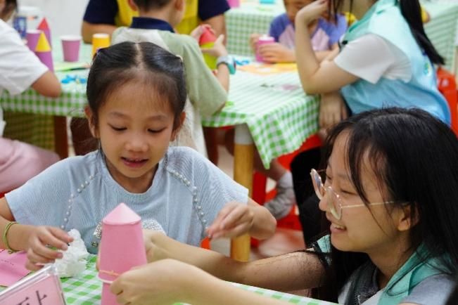 在紅色愛國主義教育課堂上,實踐團義教組成員王藝凝生動講述長征故事,以紅色經典為指引,點燃孩子們的愛國熱情,讓愛國初心在青少年心中深深扎根。非遺扎染課程中,義教組成員唐肖湘手把手教學,帶領孩子們體驗傳統工藝的魅力,素布在藍白浸染間,綻放出千年文化的韻味,讓傳統之美在青少年手中煥發新的生機。