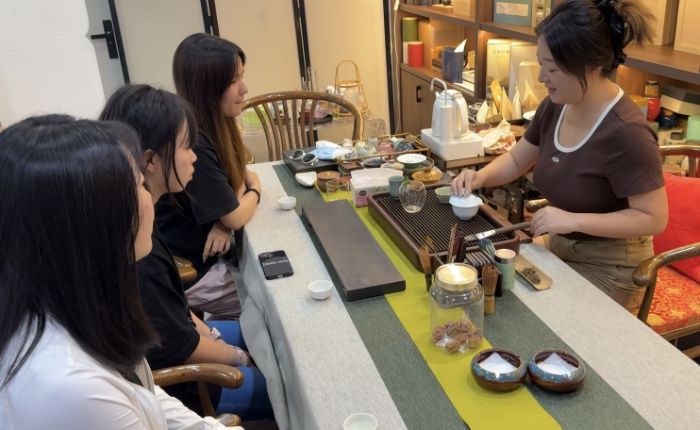 為深挖茶文化,成員們專程拜訪茶藝老師。在茶室之中,老師溫杯潔具、投茶注水,動作舒緩優雅。德旺白茶在壺中舒展,清香氤氳。老師細述沖泡技巧與品鑒要領,成員們凝神聆聽,頻頻記錄。老師以茶喻人:“茶要經揉捻才能釋放芬芳,青年也要經實踐方能成長。”一句話,讓茶香與青春在那一刻同頻共振。大家更堅定了以專業所學推廣德旺茶文化的決心,也為后續在德旺土家族苗族鄉開展茶產業振興實踐活動積累了寶貴的專業知識。大家都表示,要將所學運用到實際中,為推廣當地茶文化貢獻自己的力量。