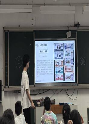 “接下來,我們要穿越到現(xiàn)代啦!”唐老師拿出一張10元人民幣,“看,這是我們現(xiàn)在用的錢,是不是比銅錢輕多了?”并用PPT為同學(xué)們詳細(xì)地展示了我國人民幣的發(fā)展歷程,通過圖片讓讓同學(xué)們更直觀地了解到人民幣的變化。