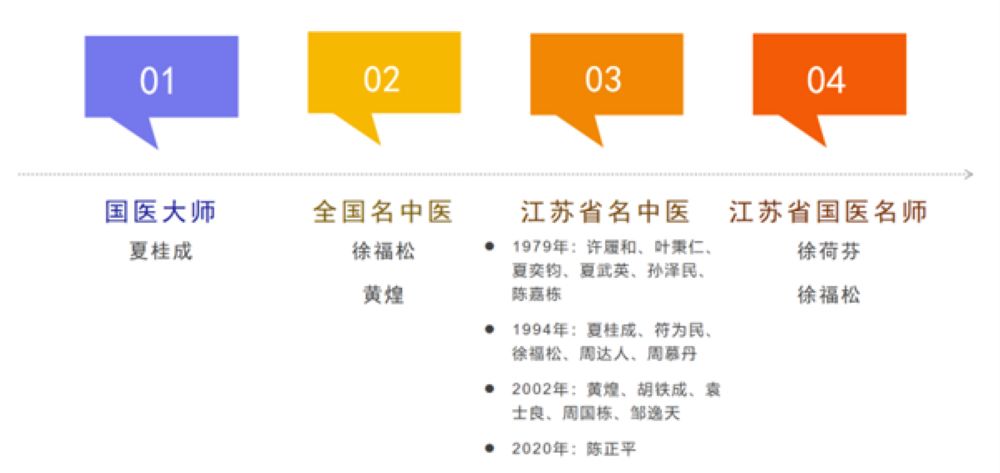 江陰籍國醫大師夏桂成,早年師承江陰名醫夏奕鈞老先生,后求學江蘇省中醫進修學校,留校任教,創中醫婦科“調周法”治療月經病和不孕不育癥,創新中醫婦科學體系,被譽為“送子觀音”;全國名中醫徐福松教授,師從其父著名兒科專家惠之公及舅舅許履和先生,中醫男科學的創始人和奠基人;徐荷芬,著名中醫腫瘤專家,江蘇首屆“國醫名師”;黃煌,全國名中醫,當代經方派代表人物,致力于經方的國際傳播;顧植山,全國第六批、第七批老中醫藥專家學術經驗繼承工作指導老師,五運六氣大家;袁士良,江蘇省名中醫,全國基層名中醫,師從柳寶詒再傳弟子薛銘章,創“清化論”,力主“病多痰濕,法從清化”治病理念,擅用溫膽湯,業界稱之為“袁溫膽”;陳正平,江蘇省名中醫,師從夏奕鈞老先生,以婦科內科病見長