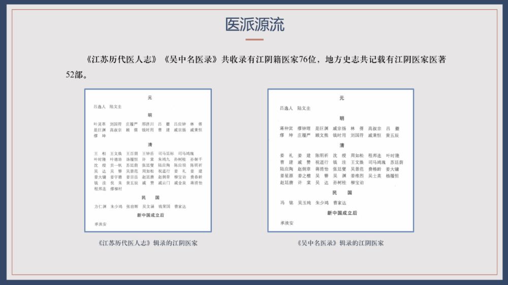 由此可見,“澄江”作為江陰之別稱已有近千年之歷史,歷代江陰的文人、士人、醫家亦有用“澄江”指代江陰的習慣,因此以“澄江”命名江陰地區的中醫流派,既能反映地域范圍,又能體現歷史特色。