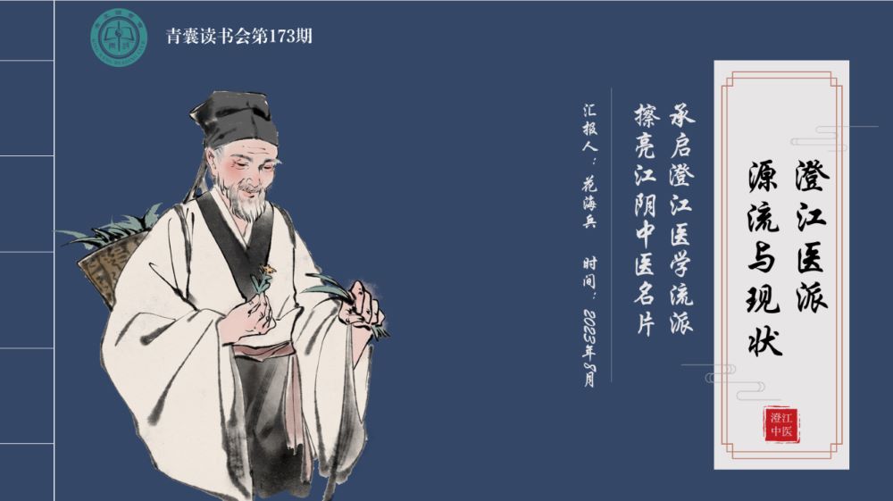 江陰,古稱“澄江”,坐落于長江下游南岸,與靖江隔江相望。江陰歷史悠久,文化底蘊深厚,有七千年人文史、五千年文明史、三千八百年筑城史與兩千五百年文字史。江陰亦有“中醫之鄉”美譽,早在魏晉時期就有有關醫學的記載。唐初,江陰置暨州時即設醫學博士,宋設醫目,元設醫學教授,負責掌管醫之政令。元初,設立惠民藥局,明清官方均設有醫學,清初本邑醫學訓科朱綅更參與了常州府醫學恢復三皇祀典的請愿活動。明清以來,澄江地區名醫輩出,近現代更是涌現出許多名醫大家。《江陰縣志》及相關史料記載的江陰著名醫家76位,醫著52余部,這些醫家醫著對澄江中醫文化產生巨大的影響,從而形成了一個以江陰為區域界定的頗具地方特色的中醫地域流派——澄江醫派。