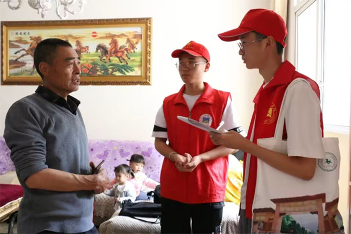 圖為志愿隊(duì)隊(duì)員對(duì)二道橋村書記沙國(guó)慶同志進(jìn)行訪談。三下鄉(xiāng)網(wǎng)通訊員 張國(guó)悅 供圖