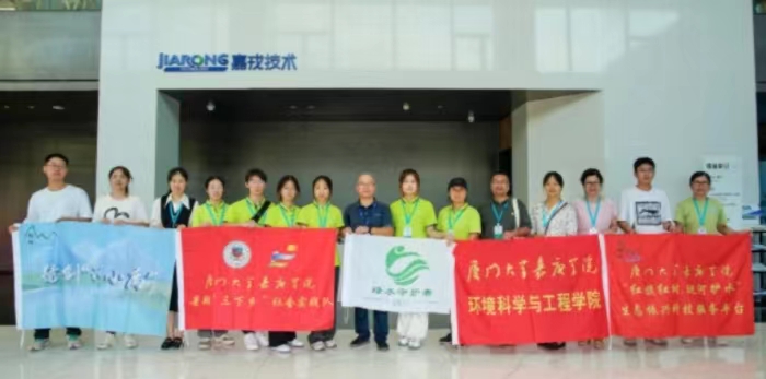 活動的第二站實踐隊來到廈門嘉戎技術股份有限公司,在產品工程師的邀請下,實踐隊隊員走進企業園區了解企業的概況、發展歷程、核心技術和應用方向。在觀看了企業宣傳紀錄片后,實踐隊隊員了解到嘉戎技術是一家以膜分離裝備、高性能膜組件等產品的研發制造與應用技術為核心,提供高濃度污廢水處理及清潔生產綜合解決方案的國家高新技術企業。