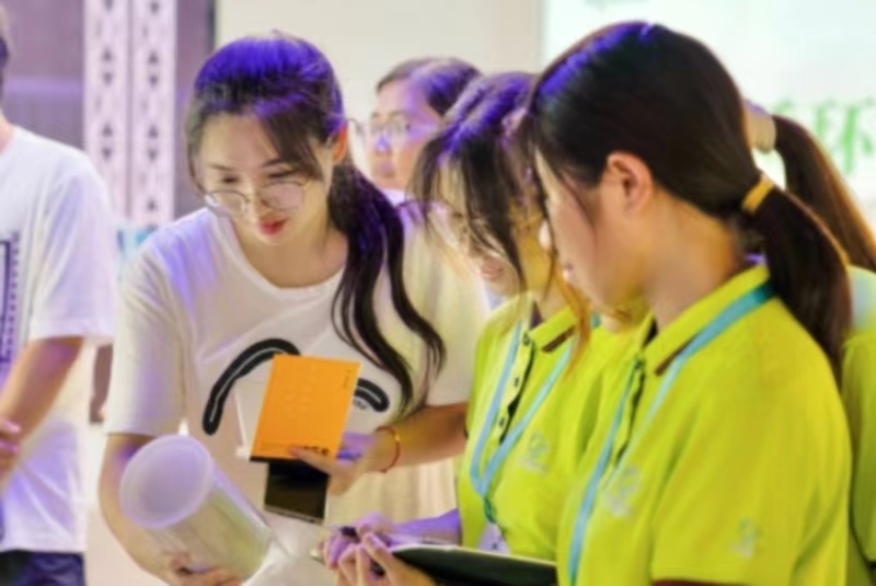 圖 實踐隊隊員查看經資源化處理后的塑料顆粒