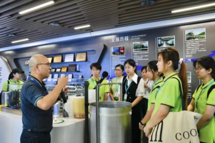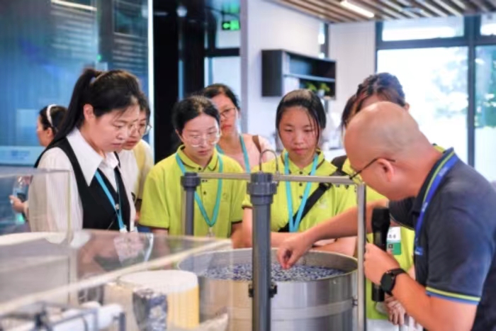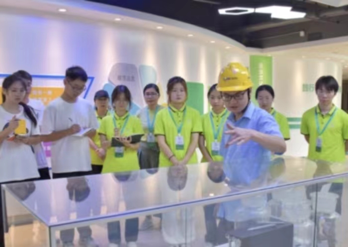 了解完精品案例,實踐隊隊員深入車間參觀了成果展廳、化學實驗室、中試基地及集裝箱式滲濾液處理設備等。產品工程師為實踐隊隊員講述發展基礎材料和核心技術的意義,只有將基礎材料和核心技術同時掌握在自己手中,才能牢牢掌握創新主動權和發展主動權。