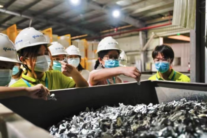 移步產業園展廳中,講解員向實踐隊隊員們揭曉了廢棄電器電子產品的“內部秘密”,破舊的外殼下是各種金屬與非金屬零配件。講解員告訴實踐隊隊員這些零配件即將迎來它們的第二次“生命”,在被拆解后,它們會依據不同材料進行分類,送至流水線進行再生利用。在賦予這些廢棄物全新形態時,不僅降低產業的碳排放量,還減輕了重金屬污染,減少了固體廢物產生,真正實現了綠色低碳循環處理。