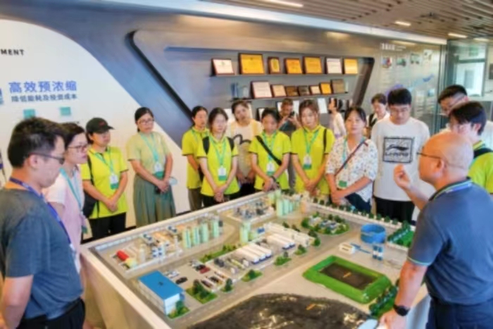 同時,項目負責人利用沙盤模型向實踐隊隊員分享已解決項目的成果案例,并提到:近年來,膜技術在飲用水深度處理、美麗鄉村計劃—農村污水治理、市政污水、工業廢水提標工程、廢水深度資源化、特種行業物質分離和提純等領域應用中呈現的物料高精度過濾、處理效果穩定、有效實現資源循環利用等特點,使膜技術的應用領域進一步拓寬,展現出良好的發展前景。