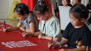 圖為小朋友們在“利劍護蕾,靜待花開”橫幅上簽字。(攝/郭嘉妮)