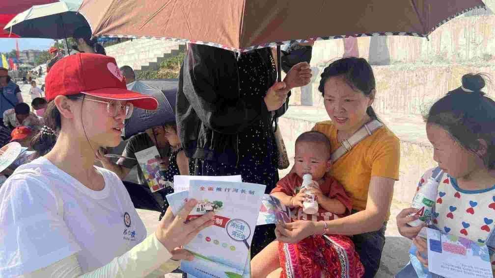 “三公”志愿服務團的隊員在向兩岸觀眾宣傳河長制