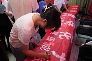 圖為活動結束后,小朋友們在“利劍護蕾 靜待花開”橫幅上簽上自己的名字。(攝/劉賢波)