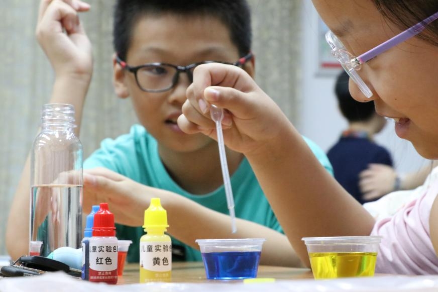 在感受了大運河文化的魅力之后,實踐團隊又帶領小朋友們走進了神奇的科學世界。第一個科學實驗是關于三原色的小實驗。實驗臺上擺放著三種顏色的液體,有藍色、黃色、紅色。講解員先向小朋友們介紹了三原色的概念,然后開始演示實驗。只見他們將不同的液體倒入一個透明的玻璃杯中,神奇的現象發生了:混合的液體形成了新的顏色。在實踐團隊成員的指導下,小朋友們親自動手進行實驗,感受著科學的奇妙。