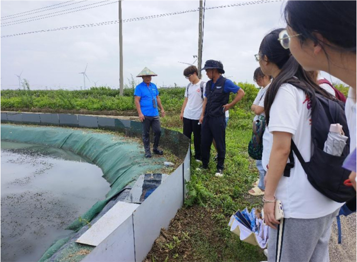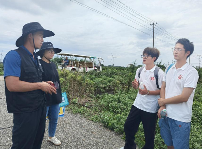 圖為實踐團(tuán)成員們詢問養(yǎng)蟹專家蟹池養(yǎng)殖情況。邱益祎 供圖