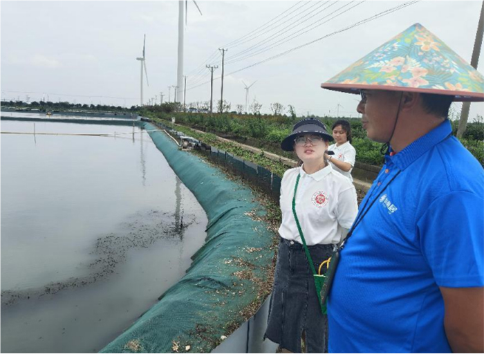 圖為實踐團(tuán)成員們與養(yǎng)蟹專家觀察蟹塘情況。邱益祎 供圖