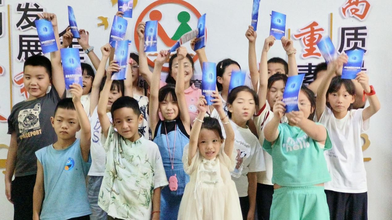 圖為小朋友手持反詐宣傳手冊在一起合影留戀的照片 通訊員 蔣佩瑾 供圖
