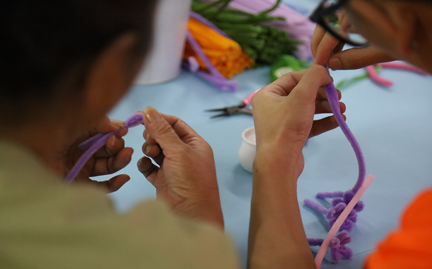 在我們與愛(ài)心媽媽們協(xié)力配合下,一朵朵形態(tài)各異、色彩斑斕的手工花逐漸成形,承載著每一個(gè)人對(duì)殘障孩童的美好祝愿。一盆盆在手中綻放的花朵,仿佛也寓意著這些兒童的未來(lái)走向明亮與多彩。