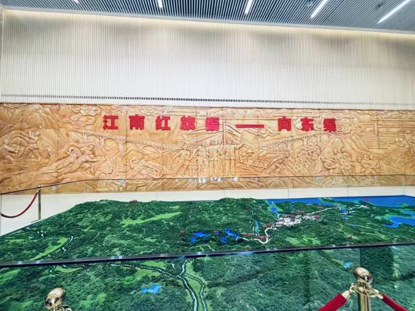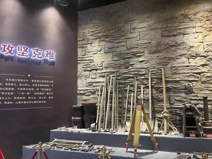 走進(jìn)向東渠事跡展示館,一段波瀾壯闊的歷史畫卷在他們眼前徐徐展開。首先映入眼簾的是一面巨大的浮雕墻,生動(dòng)地刻畫了當(dāng)年建設(shè)者們開山辟路、引渠通水的英勇場(chǎng)景。館內(nèi)陳列的老照片、泛黃的文件以及充滿歲月痕跡的工具,無聲地訴說著當(dāng)年建設(shè)向東渠的偉大壯舉。在那個(gè)物資匱乏、技術(shù)落后的年代,人們靠著堅(jiān)定的信念和頑強(qiáng)的意志,誓要讓水流穿越山川,潤(rùn)澤大地。
