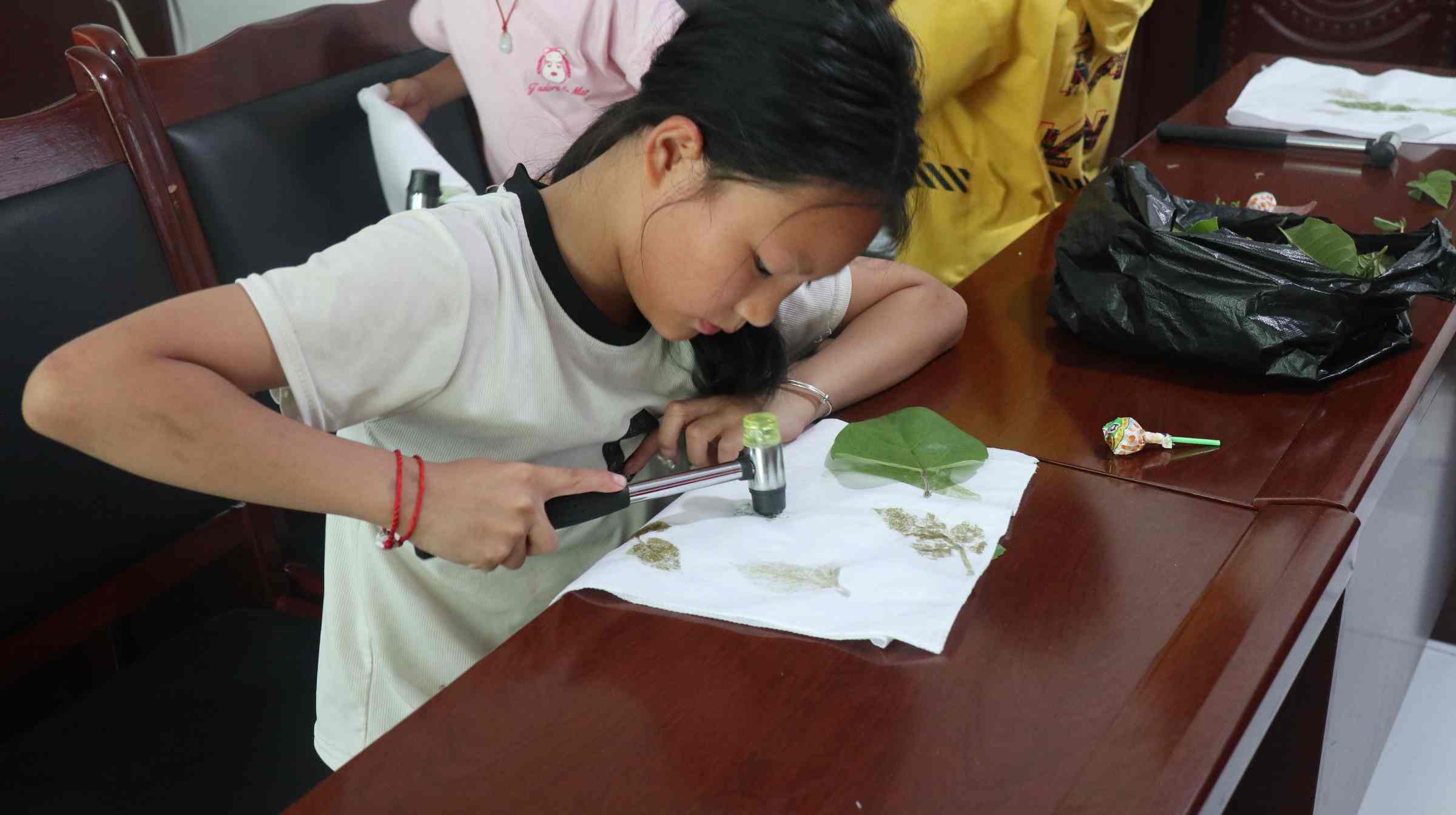 在志愿者的示范引領(lǐng)下,小錘輕敲,葉影婆娑,白色的棉布上漸漸浮現(xiàn)出葉片獨有的紋理與色彩,仿佛大自然的筆觸在無聲中勾勒出一幅幅生動的畫卷。孩子們的眼神中閃爍著探索的光芒,每一次敲打都是對自然之美的致敬,也是對生態(tài)保護的初步實踐。