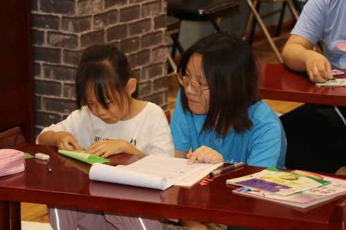 上午八點,實踐團進行了專項學習活動。成員們首先進行的是語文作業專項輔導,孩子們便在成員們的認真協助下開始了今天的學習,孩子們在一筆一劃認真完成著自己的語文作業,成員們主要幫助孩子們保持專注及幫助孩子進行閱讀理解學習。隨著孩子們逐漸完成自己的語文作業,成員開始了對孩子們細致的作業調查,以便進行后續的專項輔導。與此同時,其他成員也在幫助孩子們完成其他科目的作業,針對孩子的實際學習階段分項輔導孩子們。在數學科目的輔導中,成員們發現孩子們的乘法口訣還沒有記住,便在剩余的時間專門進行了詳細教學。