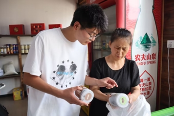 圖為土特產店老板向團隊成員介紹當地農戶自產山核桃產品時的場景。三下鄉網通訊員 劉夢杰 攝