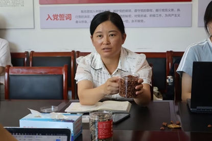 圖為磡頭村洪書記向小分隊成員們介紹家朋鄉山核桃產品時的場景。三下鄉網通訊員 王珍蒂 攝