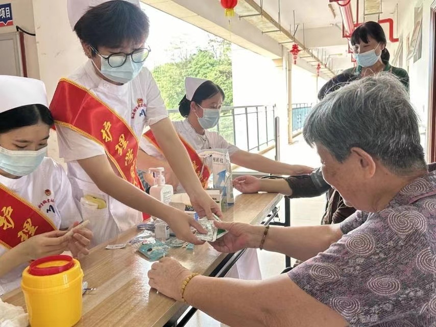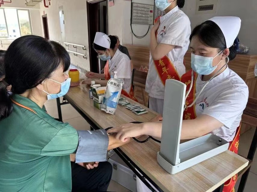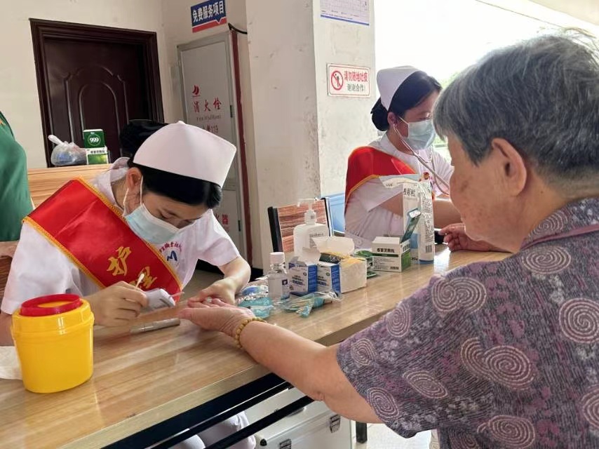 另一邊為行動不便的老人,志愿者充滿關懷地來到房間里,為老人仔細的進行測量血壓及發放健康宣教單并送上日常藥品。