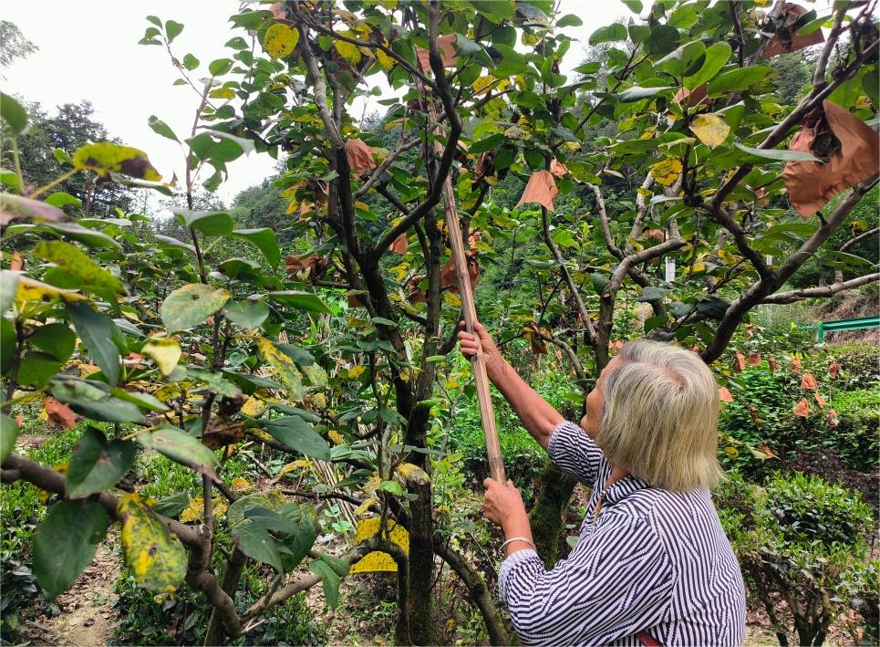 聯系了村里的一位奶奶后,奶奶帶領著團隊成員去到了田里。此時的雪梨還沒有太成熟,個頭也不是很大,外面還包了一層紙,這是在梨子還小時便為它包扎上的。