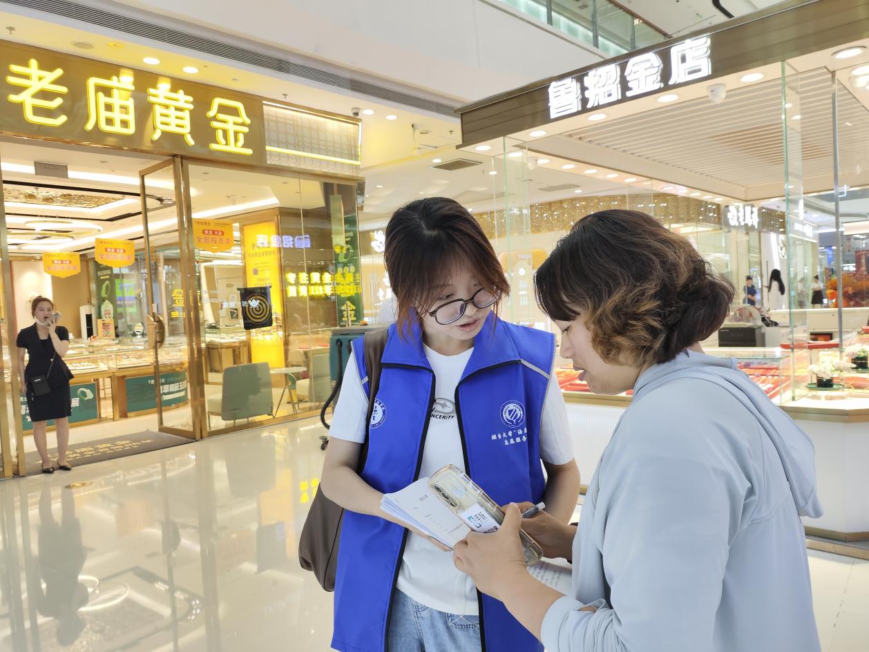 (圖為實(shí)踐隊(duì)成員在萬(wàn)達(dá)商場(chǎng)內(nèi)向群眾發(fā)放調(diào)查問(wèn)卷 “法盾防詐”實(shí)踐隊(duì) 楊春玉供圖)
