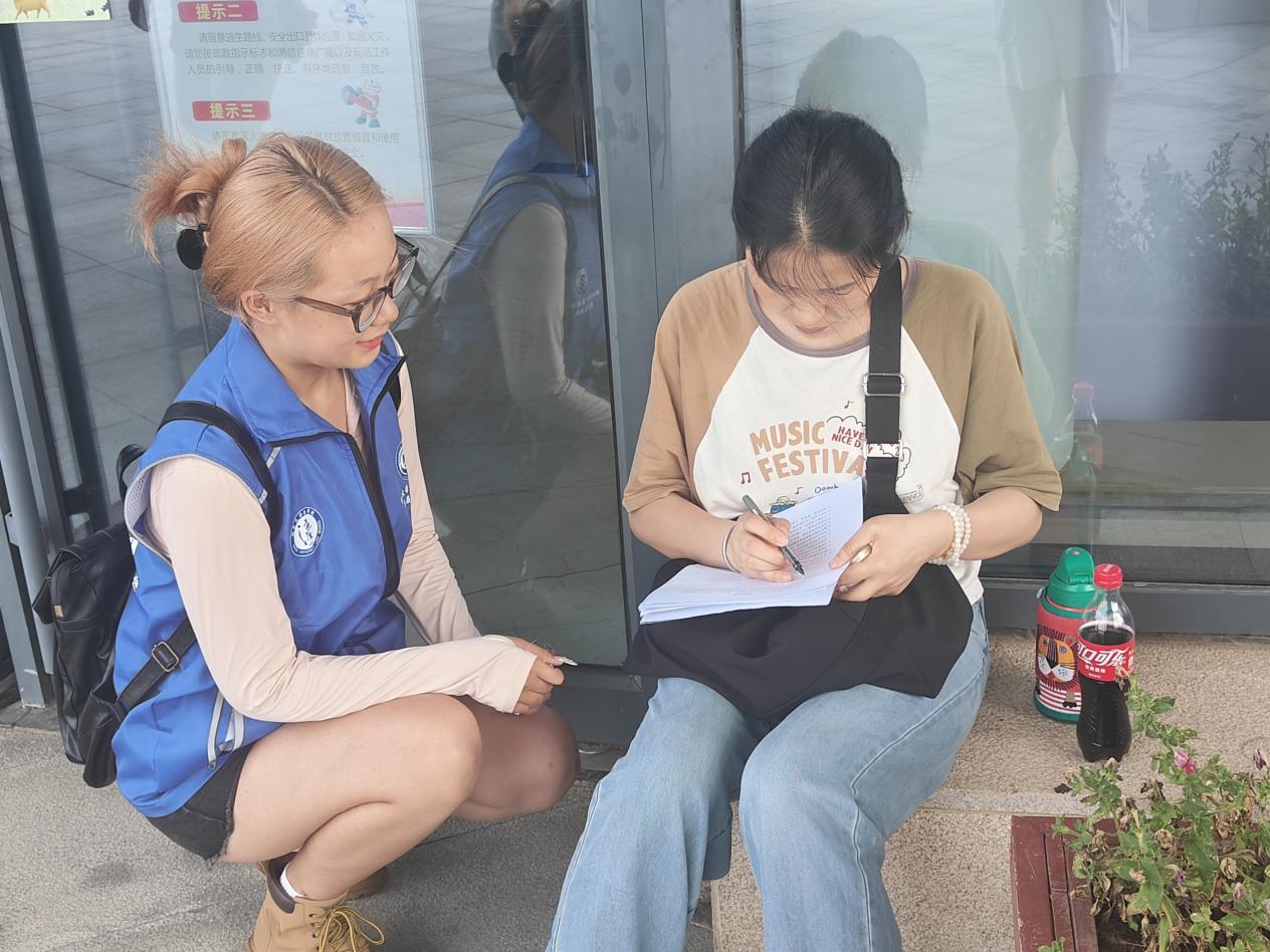 (圖為實(shí)踐隊(duì)成員向居民發(fā)放調(diào)查問(wèn)卷并講解幫信罪知識(shí) “法盾防詐”實(shí)踐隊(duì) 張樂(lè)窈 供圖)