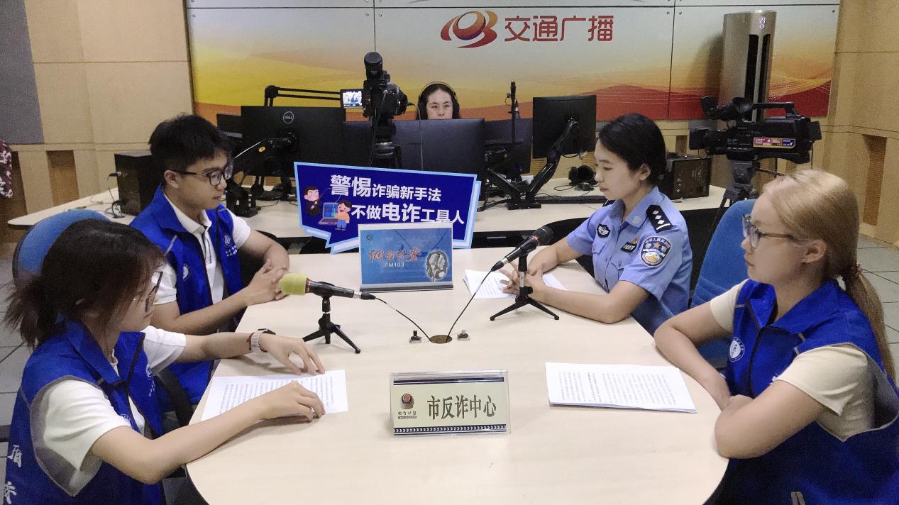 為進一步加強反詐宣傳力度,切實增強群眾的防騙意識和識騙能力,積極營造全民反詐、全社會反詐的濃厚氛圍,中央宣傳部、公安部聯合啟動了以“警惕詐騙新手法,不做電詐工具人”為主題的“全民反詐在行動”集中宣傳月活動。7月12日,煙臺大學“法盾防詐”實踐隊與煙臺市公安局反詐中心民警走進煙臺市廣播電臺FM103《煙臺公安》節目直播間進行防范宣傳專題播報,宣傳反詐知識,介紹煙臺大學法學生的反詐防詐宣傳故事。