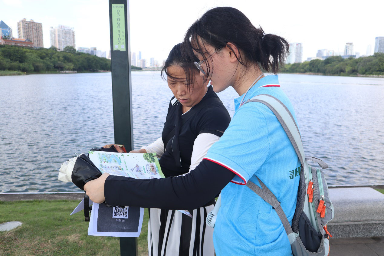 首先了解了公園的基本概況后,實踐團隊分成3個小組,分別進行調查問卷發放、環保知識科普、以及小禮品的發放。