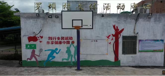 羅壩村黨群服務中心與黃沙村籃球場的墻面,則根據場地的運動特色和宣傳功能,繪制了“大力實施‘百千萬’工程  建設宜居宜業和美鄉村”、“踐行全民運動 樂享健康中國”等標語,積極宣傳“百千萬工程”、全民健身的理念。用簡約的籃球、運動、和平鴿等圖案凸現場地屬性。