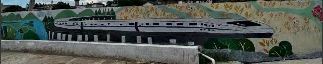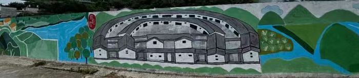 在周興村芒頭下,客家韻味濃厚,76米長的墻體圍著古樸的圍龍屋,圈出一塊供村民健身鍛煉的空間。墻繪中大篇幅融入了當地的自然人文景象,寧靜的水流蜿蜒滋養著廣袤的稻田,穿梭其中的高鐵,代表即將開通的梅龍高鐵。站在這處墻繪龐,便可以看到梅龍高鐵的高架橋在村莊上延伸向遠方,相信興寧的發展會和梅龍高鐵一樣提速高效。