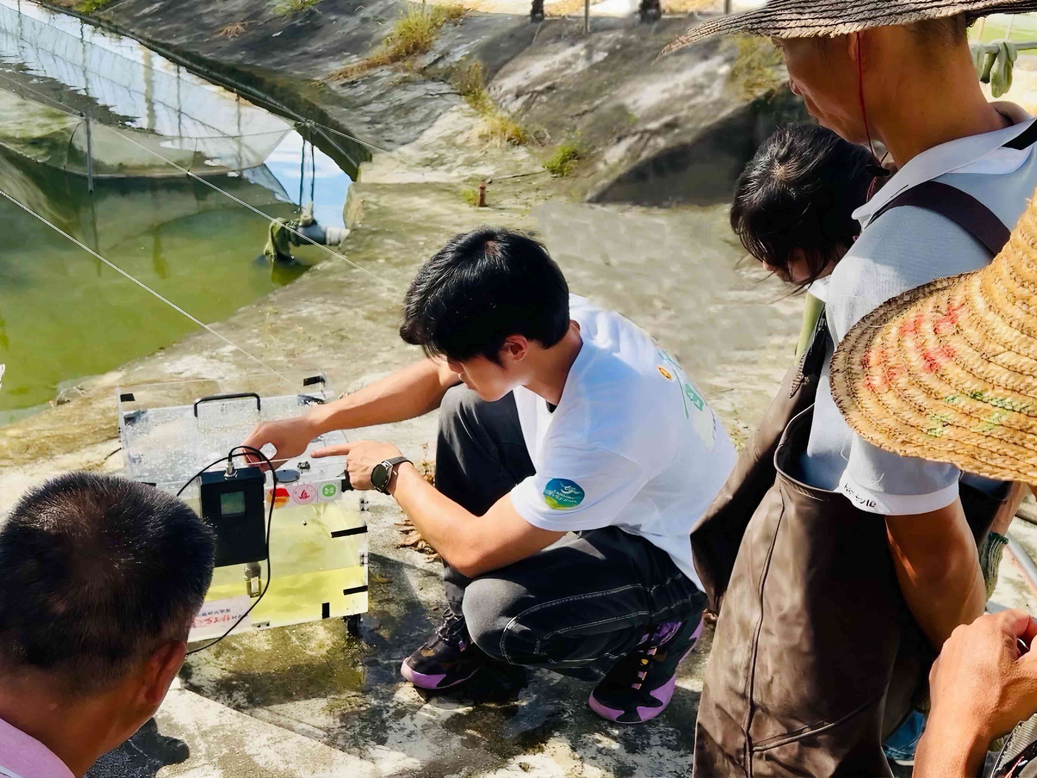圖為佛大漁躍鄉村推普實踐團用普通話為新興縣都斛村漁民講解團隊研發的智慧魚苗運輸設備的使用方法。通訊員 何鴻櫻 供圖