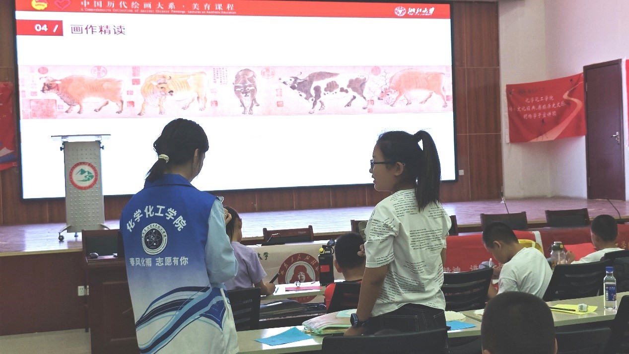 圖為團(tuán)隊(duì)成員李燦燦為現(xiàn)場(chǎng)同學(xué)做花鳥(niǎo)經(jīng)典畫(huà)作的精讀