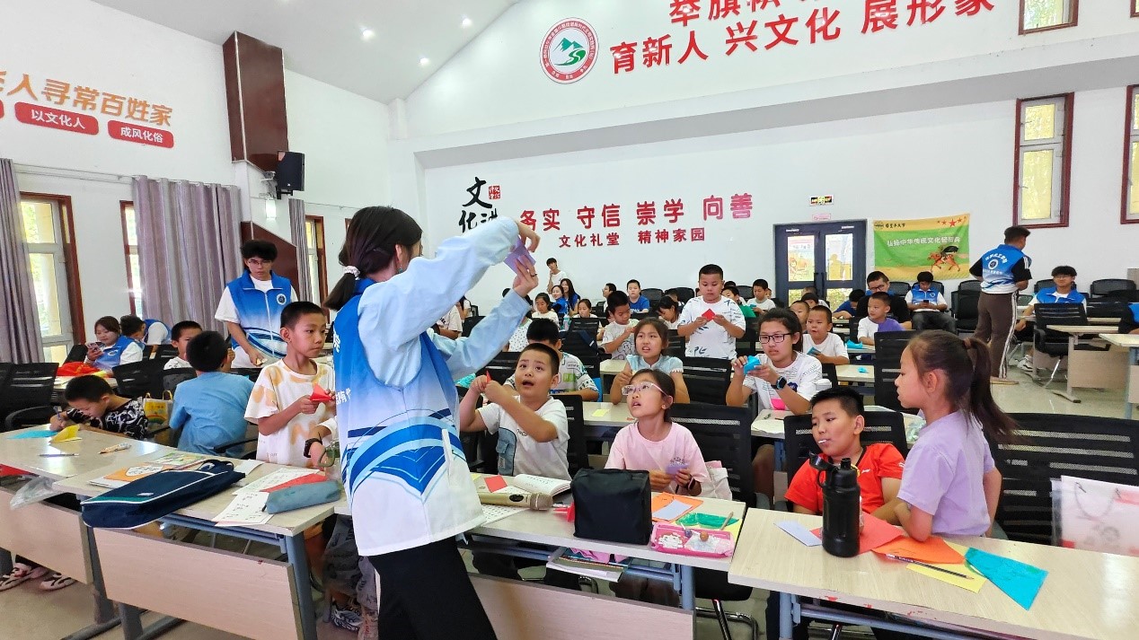 圖為團(tuán)隊(duì)成員李燦燦為現(xiàn)場(chǎng)同學(xué)教學(xué)手工藝品