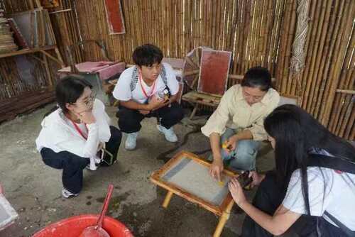 實踐隊的第一站是鄉愁集市。在這里,師生們仿佛走進了時光的隧道,親身感受著古法造紙這一古老技藝的魅力。他們不僅參觀了古法造紙的工藝流程,更親手體驗了這一傳統技藝的神奇??粗粡垙埣堅谧约菏种兄饾u成型,隊員們深深感受到了傳統文化的博大精深。那些通過古法造紙制作出的精美成果,更是讓大家對勞動人民的智慧贊嘆不已。