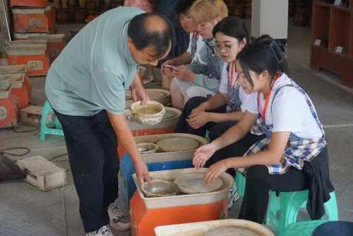 離開古法造紙的展示區域,實踐隊來到了土陶館。土陶館里,母先才先生熱情地迎接了師生們。他向大家講述著花茂村土陶的歷史和發展,隊員們聽得津津有味。在母先才先生的指導下,部分隊員還親手嘗試了土陶制作的過程。從揉泥到塑形,每一個步驟都充滿了挑戰和樂趣。母先才先生感慨地說:“都是因為鄉村旅游的發展,才帶活了我們這些傳統手藝人的生意。”如今,花茂村的土陶產業在傳承中創新,煥發出新的生機。