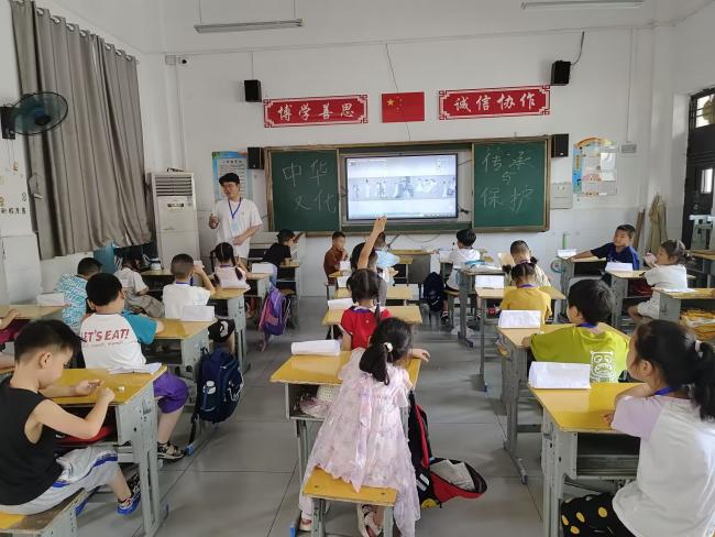 7月24日消息(通訊員 嚴煜 蘭自強 董俊逸 楊雨欣 向倩 柯韻萌)為讓學生們深入了解國家文化遺產,培養他們對傳統文化的興趣,同時傳授保護中華文物的重要知識和技能,武昌理工學院第十八屆“大手牽小手”云夢書韻志愿服務隊于7月24日在云夢縣城關鎮曙光小學舉辦了一場主題為“中華文物的保護與傳承”的特色課程。支教隊隊員鄭力維擔任本次課程的主講人。