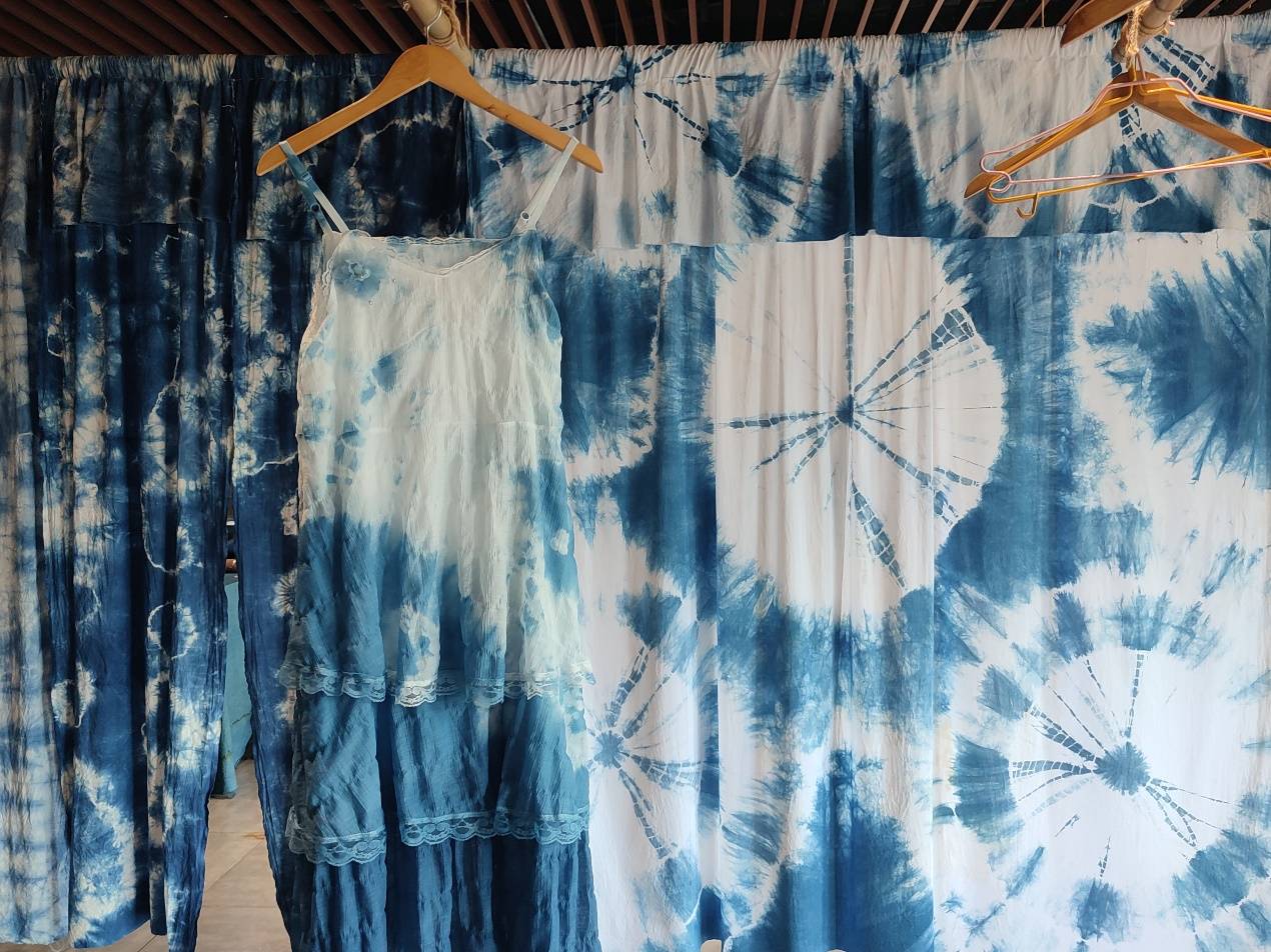 在工坊主人的引領(lǐng)下,我們得知錦繡苑工坊的染液主要提取自藍靛,而扎染工藝則主要采用普通扎染技術(shù)。普通扎染通過將織物以對角、折疊、不同方式的折曲并自行打結(jié)抽緊,創(chuàng)造出阻斷染液滲透的效果,或是利用各種形狀的木板、竹片、竹棍將折疊后的織物夾緊,再用繩索捆綁牢固,形成獨特的防染圖案,如水波紋、蝴蝶花等。