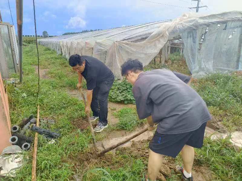 姜波帶領(lǐng)實(shí)踐團(tuán)隊(duì)查看了受淹地玉米長勢情況和農(nóng)田積水情況,在簡單的分工后,大家紛紛擼起袖子和褲腿、拿起鐵锨,采用抽水泵、挖通排水溝等方法加速排水,幫助村民疏通堵塞溝渠,保障溝渠排水流暢,防止農(nóng)作物受淹。經(jīng)過長達(dá)6個(gè)小時(shí)的防汛排澇工作,農(nóng)田積水狀況顯著好轉(zhuǎn)。