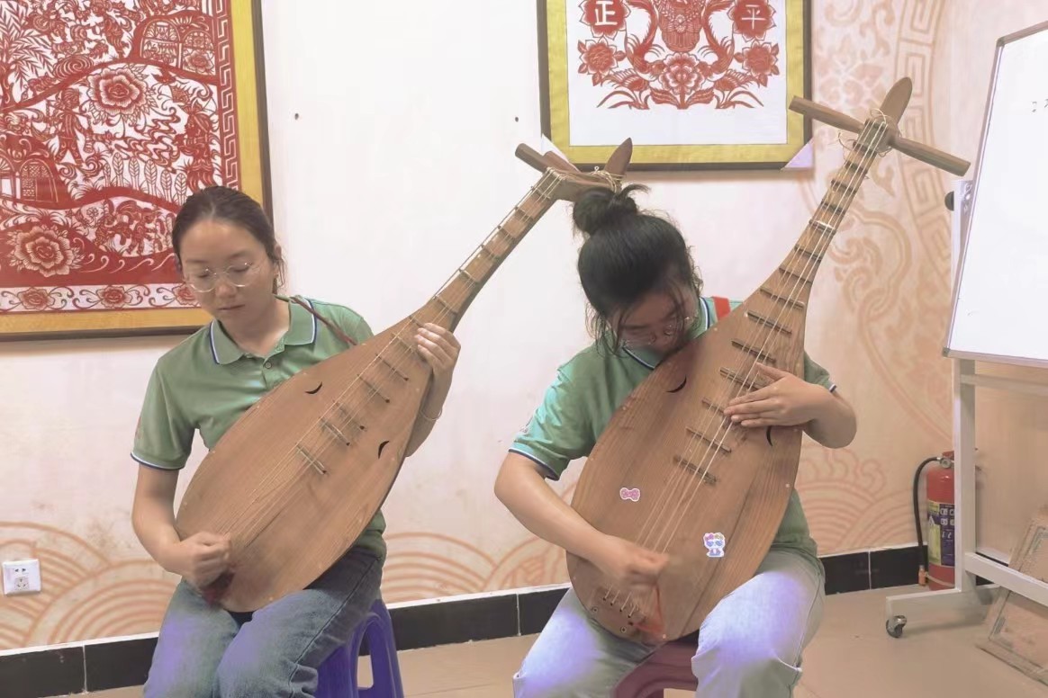 圖為調(diào)研團(tuán)成員正在學(xué)習(xí)曲頸琵琶的演奏。通訊員 王思茹 供圖