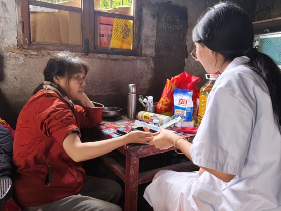 在走訪過程中,實踐團深入了解了文桂村的劉興模以及蜂水村兩戶人家,其生活艱難困苦,患有卵巢癌、乳腺癌、高血壓、糖尿病等多種疾病。他們對于實踐團的到來表達出由衷欣喜與感激。實踐團成員攜牛奶、急救包、油等多種慰問品上門,不僅幫助老人們打掃房屋、整理家務,還與他們促膝長談,傾聽他們的心聲。更用自己的專業知識,為老人們測血壓、測血糖,根據其實際情況,提出適當的飲食等健康生活建議。將理論知識運用于實踐,將大學知識用于推動社會進步,這也是三下鄉實踐活動意義所在。