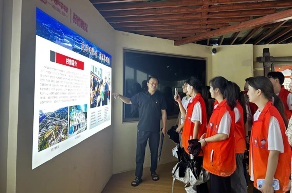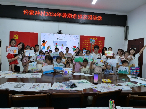 圖1-2 實(shí)踐團(tuán)出征合照,參觀許家沖文化長(zhǎng)廊(王小晶/攝)7月10日,在溫暖的晨光中,許家沖村黨群服務(wù)中心的小教室里坐滿了小朋友,一張張熟悉的面孔映入眼簾。這是服務(wù)隊(duì)第三次前往許家沖村為當(dāng)?shù)氐暮⒆觽冮_展志愿服務(wù)活動(dòng),在許家沖村黨支部副書記朱崇軍的介紹下,今天的課程拉開了序幕。