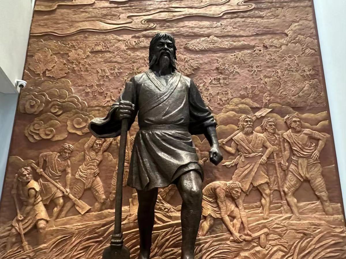 泰伯以其帶來的周原先進文化,結合江南水鄉(xiāng)的特點,帶領當?shù)鼐用耖_掘人工運河“泰伯瀆”,就是今天的伯瀆港。泰伯瀆東連漕湖,西接運河,流經(jīng)吳國的發(fā)祥地梅里(今梅村)。它保證了兩岸農(nóng)田的灌慨,便利了遠近的舟楫往來,對吳國的經(jīng)濟發(fā)展起了重要作用。時至今日,伯瀆港仍是溝通梅村與外界聯(lián)系的重要水道。館內(nèi)還陳設有一座巨型雕像給團隊成員留下了深刻印象,泰伯手持工具,開鑿挖渠,磅礴氣勢撲面而來。除此之外,泰伯帶來的其他先進文化與當?shù)厝诤希矊系貐^(qū)的生產(chǎn)力發(fā)展和經(jīng)濟發(fā)展帶來不可磨滅的貢獻。所以民間常言“江南文化始泰伯”。