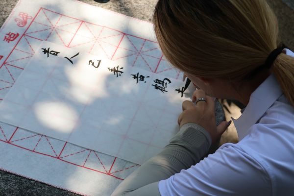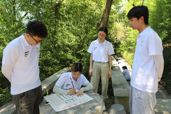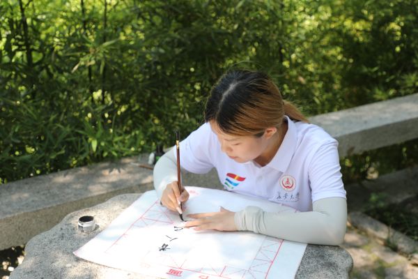 書法不僅僅是一種藝術(shù)表現(xiàn)形式,更是一種精神追求和文化傳承,展現(xiàn)了中華優(yōu)秀傳統(tǒng)文化的精髓。為進(jìn)一步深化隊(duì)員們對(duì)傳統(tǒng)文化的體驗(yàn),參觀完黃鶴樓后,實(shí)踐隊(duì)在黃鶴樓公園開(kāi)展了“筆墨追先賢”主題書法創(chuàng)作活動(dòng),實(shí)踐隊(duì)員唐羽琴即興寫下了一幅書法作品,受到隊(duì)員們的一致認(rèn)可。此次書法體驗(yàn)不僅加深了實(shí)踐隊(duì)的藝術(shù)理解,也讓隊(duì)員們?cè)俅胃惺艿街腥A文化的當(dāng)代生命力。