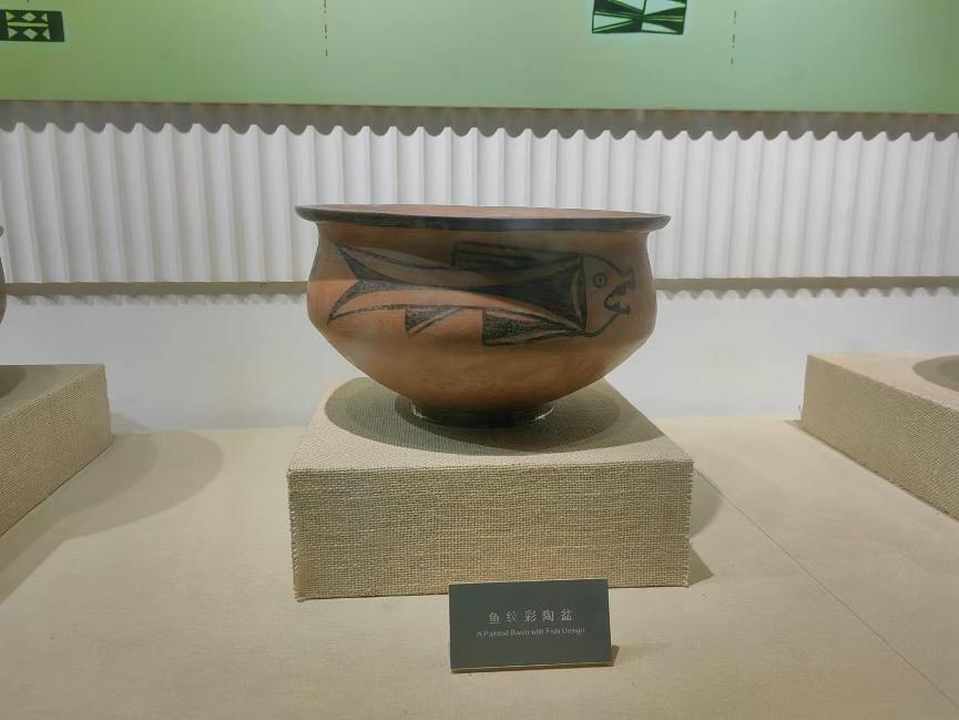 臨時展廳中,團隊成員觀賞了半坡文化遺址的部分文物。其中,魚紋彩陶瓶作為半坡文化的代表性、標志性手工產品,顯示出新石器時代黃河流域手工業的發展情況。瓶上繪制的精美魚紋圖案也與半坡人民的祭祀信仰有關,魚紋很可能來自祭祀時主祭人佩戴的面具,這被認為是先民和上天交流的一種手段。