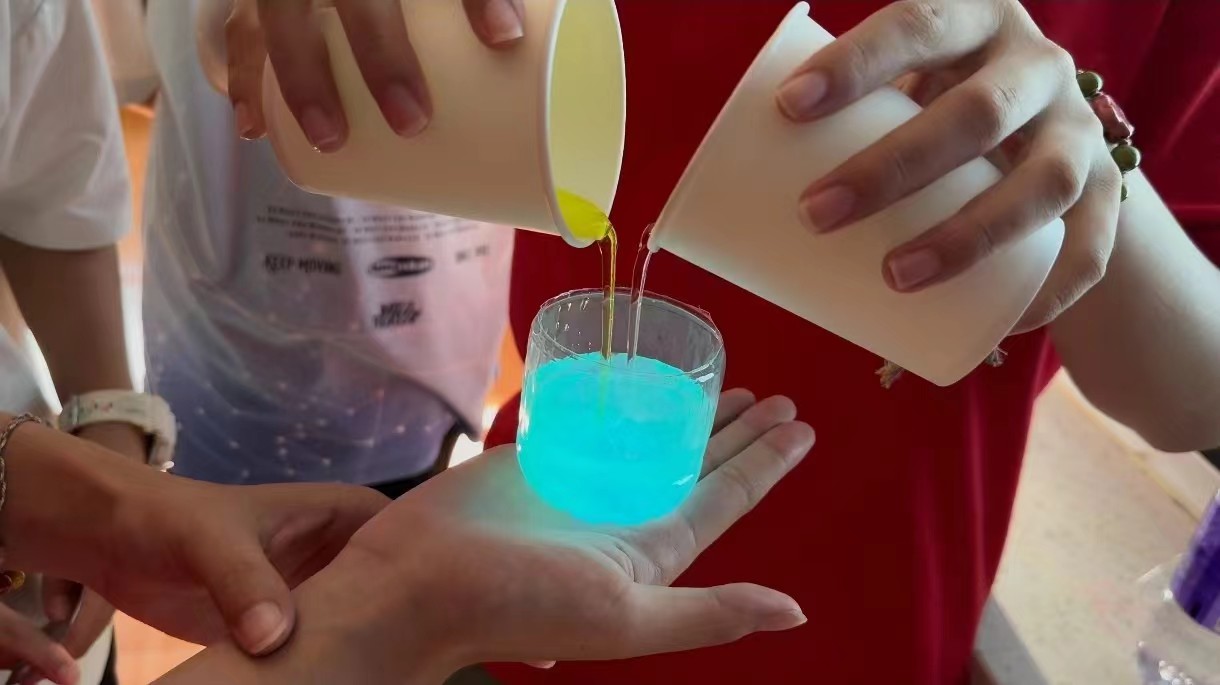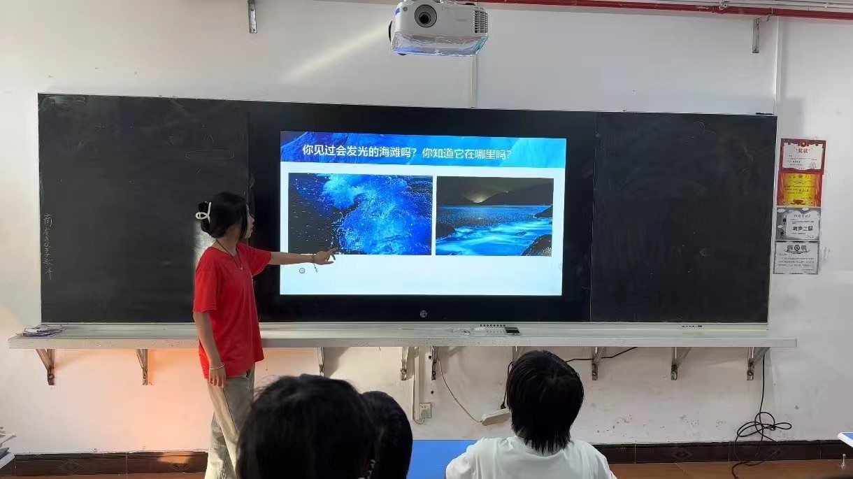 在探索了水的奧秘后,志愿者們借助一系列精心設(shè)計(jì)的動(dòng)畫(huà)與圖片,為孩子們?cè)敱M闡述了“藍(lán)眼淚”現(xiàn)象的由來(lái)。他們明確指出,“藍(lán)眼淚”是由特定類(lèi)別的浮游生物,如海螢與夜光藻,在夜晚遭遇外界刺激時(shí)所展現(xiàn)出的藍(lán)色熒光現(xiàn)象。隨后,志愿者們進(jìn)一步講述了“藍(lán)眼淚”現(xiàn)象產(chǎn)生的條件,并強(qiáng)調(diào)了如何保護(hù)海洋環(huán)境以減少對(duì)這類(lèi)生物的不利影響。為加深孩子們的理解與興趣,志愿者們還通過(guò)魯米諾反應(yīng)實(shí)驗(yàn),成功模擬了“藍(lán)眼淚”的發(fā)光過(guò)程,讓孩子們?cè)诎堤幱H眼見(jiàn)證了藍(lán)色光芒的奇妙展現(xiàn)。這一互動(dòng)環(huán)節(jié)極大地激發(fā)了孩子們對(duì)自然界奧秘的好奇心與探索熱情。