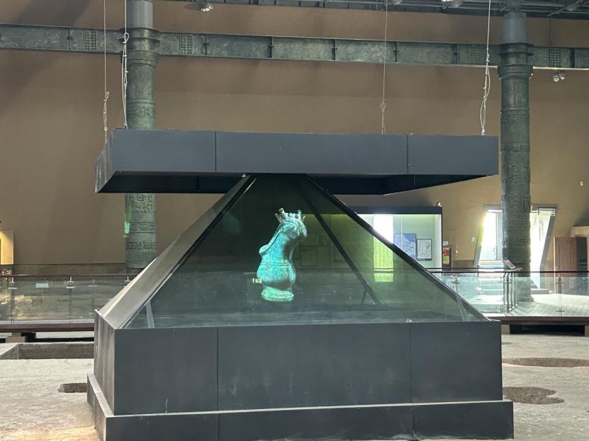 隨后,實(shí)踐團(tuán)來到了與眾不同的車馬坑展區(qū)。不同于常見的車馬坑,這里的馬匹以站立姿態(tài)入葬,其形制獨(dú)特,彰顯了墓主人非凡的身份地位。依據(jù)周禮“天子駕六,諸侯駕四”的規(guī)制,推測(cè)該墓主人地位堪比諸侯,進(jìn)一步證明了齊國(guó)作為東方大國(guó)的強(qiáng)盛與繁榮。