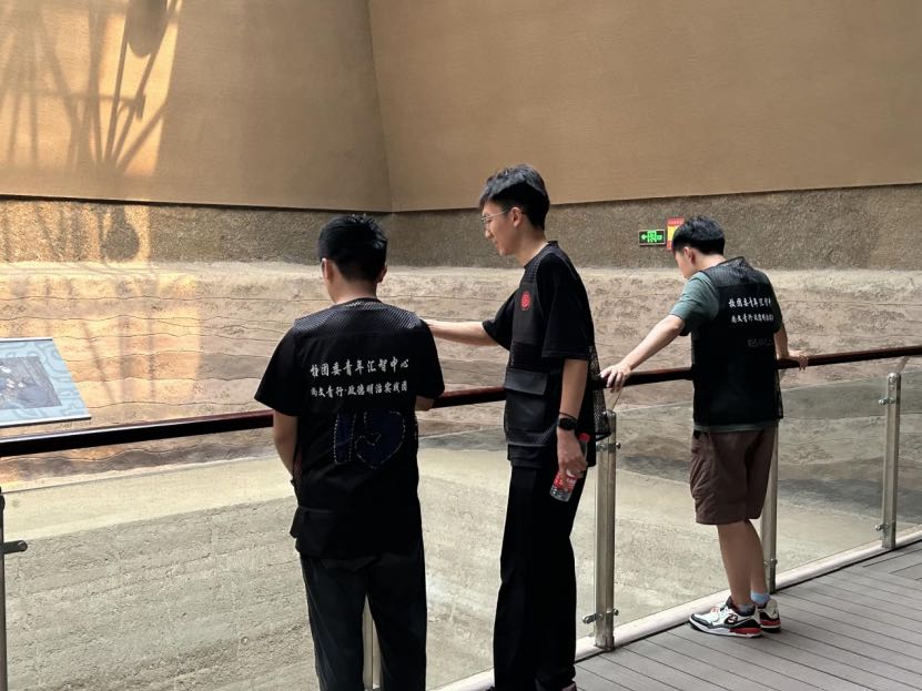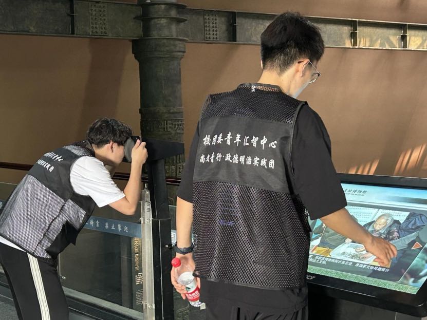 圖為團(tuán)隊(duì)成員利用現(xiàn)代多媒體技術(shù)參觀展區(qū)